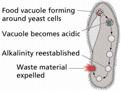 Nas espécies de vida livre há formação de vacúolos digestivos. As partículas alimentares são englobadas por pseudópodos ou penetram por uma abertura pré-existente na membrana, o citóstoma. Já no interior da célula ocorre digestão, e os resíduos sólidos não digeridos são expelidos em qualquer ponto da periferia, por extrusão do vacúolo, ou num ponto determinado da membrana, o citopígio ou citoprocto (www.biomania.com.br/protista).