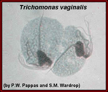 Trichomonas vaginalis é responsável pela doença chamada tricomoníase, é encontrado na vagina e no trato urinário masculino. Normalmente é transmitido pelo contato sexual, mas também pode ser transmitido em banheiros e por toalhas (www.portalbrasil.net/educacao_seresvivos_protistas.htm).